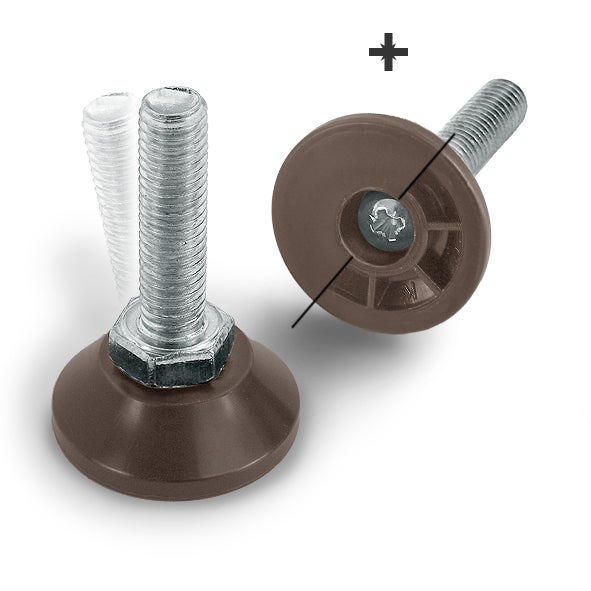 Adjustable foot with a wider base and a slot for a flat screwdriver underneath. Ideal for furniture and shop fittings. Available in various screw lengths and M-threads.